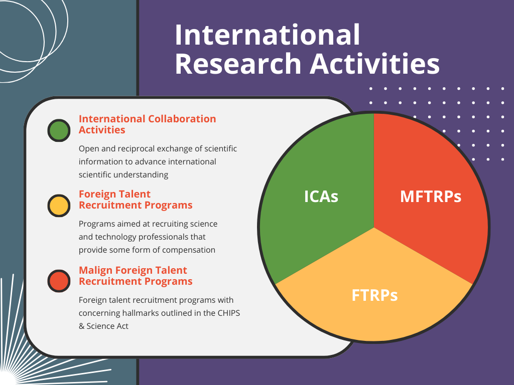 These categories are defined by the CHIPS and Science Act and resulting Office of Science and Technology Policy (OSTP) policy guidance to help guide federal research agencies in drafting and implementing their individual policies. Available agency policies will be linked under "Resources" as they become available.