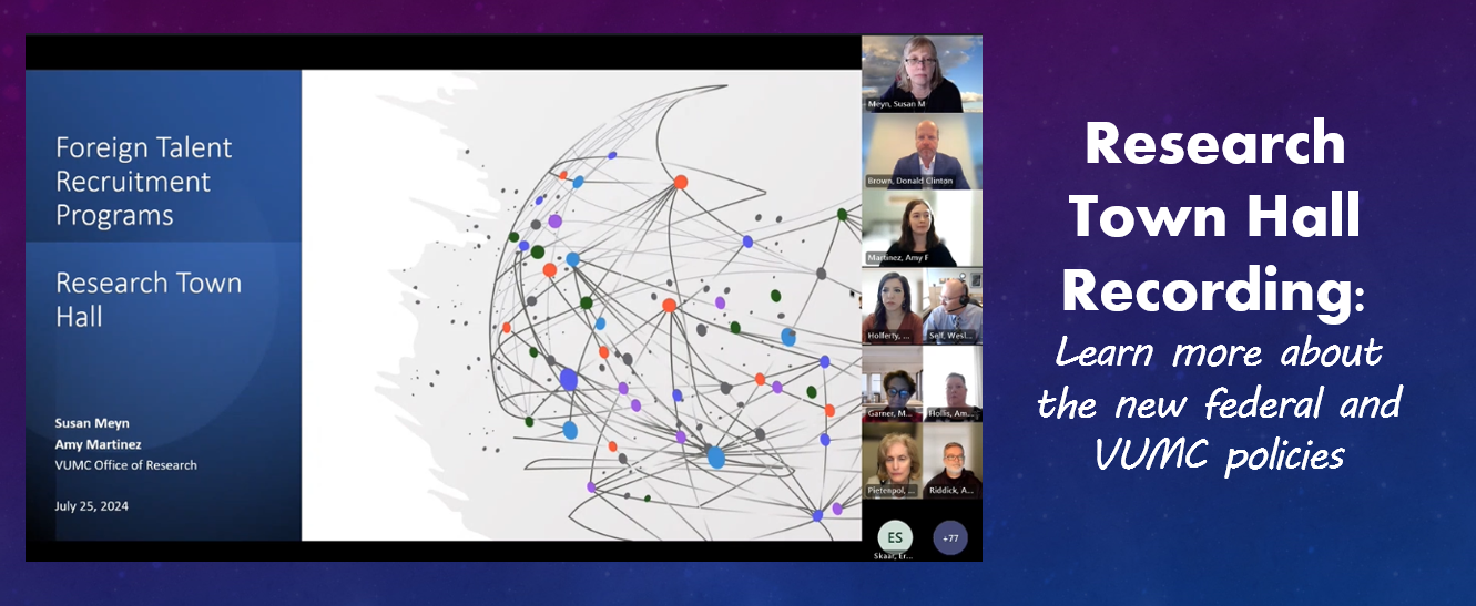 • The VUMC "Participation in Foreign Talent Recruitment Programs" policy is effective as of July 2024. The policy defines Foreign Talent Recruitment Programs and outlines acceptable and prohibited international collaboration activities.
